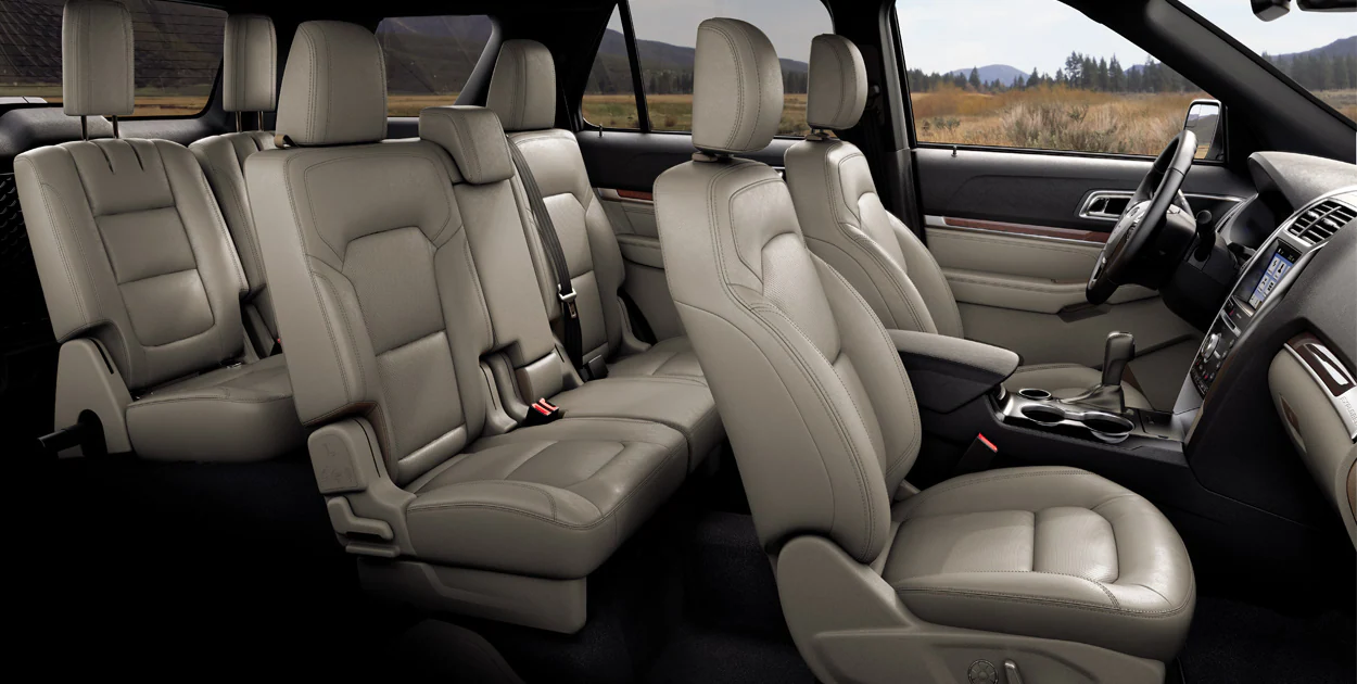 Hàng ghế trước với tính năng massage vùng tựa lưng và đệm ngồi tích hợp điều chính đa hướng chủ động bằng điện Active Motion chỉ có ở dòng xe sang trọng. Thiết kế nội thất sang trọng, tinh tế với nhưng chi tiết ốp gỗ, cùng những điểm nhấn mạ crôm và đường khâu cầu kỳ độc đáo. Explorer được trang bị hàng ghế trước điều chỉnh điện 8 hướng cùng tính năng ghi nhớ vị trí của ghế lái, độ cao thấp của bàn đạp ga và phanh, gương chiếu hậu gập điện, tất cả chỉ với một nút bấm. Trần xe cao ở hàng ghế thứ 2 và khoảng để chân ở ghế thứ 3 rộng nhất trong phân khúc khiến hành khách trên xe luôn thoải mái trong suôt hành trình